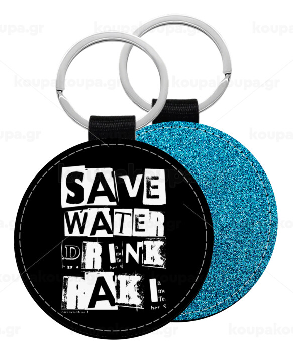 Save Water, Drink RAKI, Μπρελόκ Δερματίνη, στρογγυλό ΜΠΛΕ (5cm)