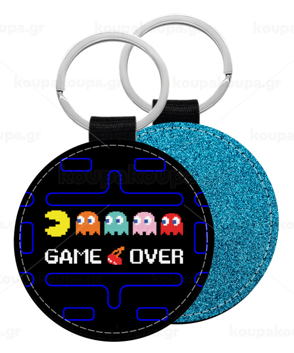 GAME OVER pac-man, Μπρελόκ Δερματίνη, στρογγυλό ΜΠΛΕ (5cm)