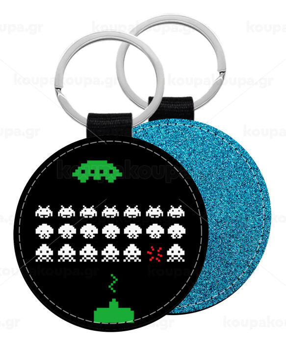 Space invaders, Μπρελόκ Δερματίνη, στρογγυλό ΜΠΛΕ (5cm)