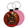 Leatherette keychain with glitter on one side and high resistance leatherette on the other. Safety ring for the keys.
