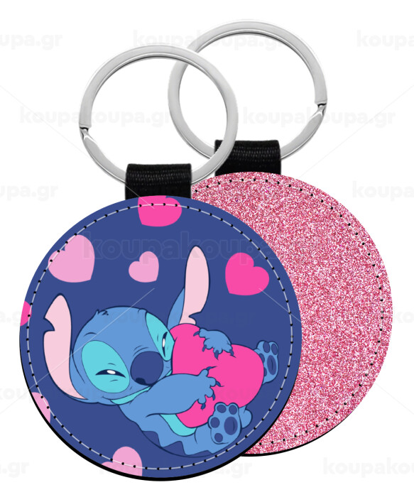 Lilo & Stitch hugs and hearts, Μπρελόκ Δερματίνη, στρογγυλό ΡΟΖ (5cm)