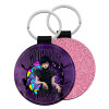 Leatherette keychain with glitter on one side and high resistance leatherette on the other. Safety ring for the keys.