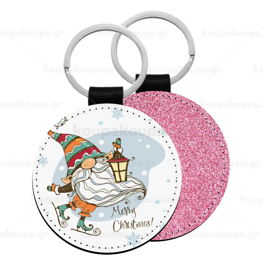Christmas nordic gnomes, Μπρελόκ Δερματίνη, στρογγυλό ΡΟΖ (5cm)