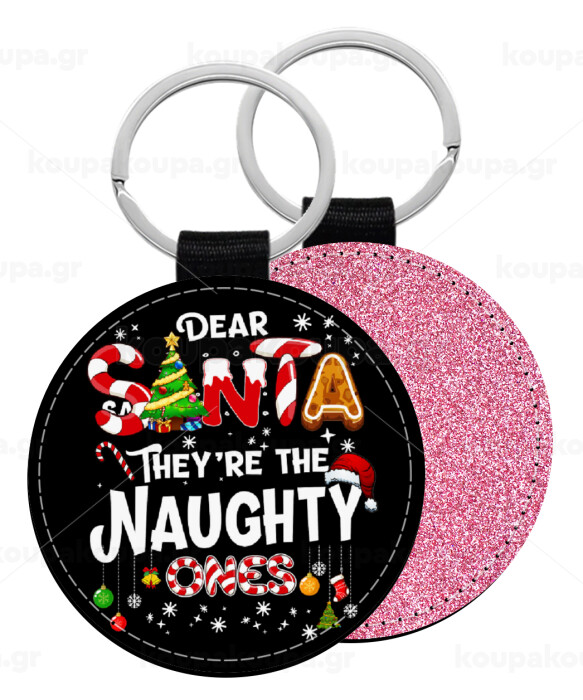 Dear santa they're the naughty , Μπρελόκ Δερματίνη, στρογγυλό ΡΟΖ (5cm)