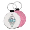 Leatherette keychain with glitter on one side and high resistance leatherette on the other. Safety ring for the keys.