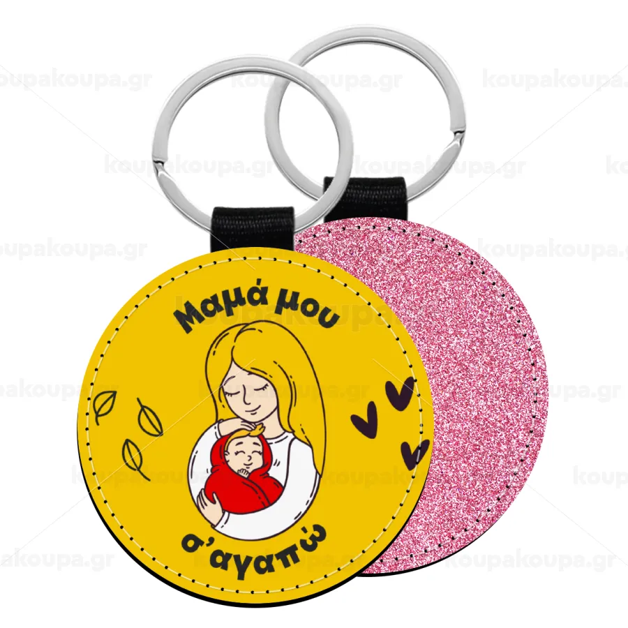 Μανούλα σ'αγαπώ αγκαλιά!, Μπρελόκ Δερματίνη, στρογγυλό ΡΟΖ (5cm)