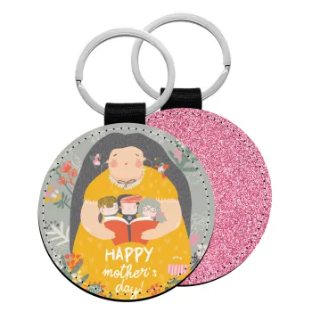 Cute mother reading book, happy mothers day, Μπρελόκ Δερματίνη, στρογγυλό ΡΟΖ (5cm)