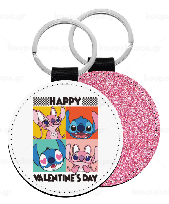 Lilo & Stitch Happy valentines day, Μπρελόκ Δερματίνη, στρογγυλό ΡΟΖ (5cm)