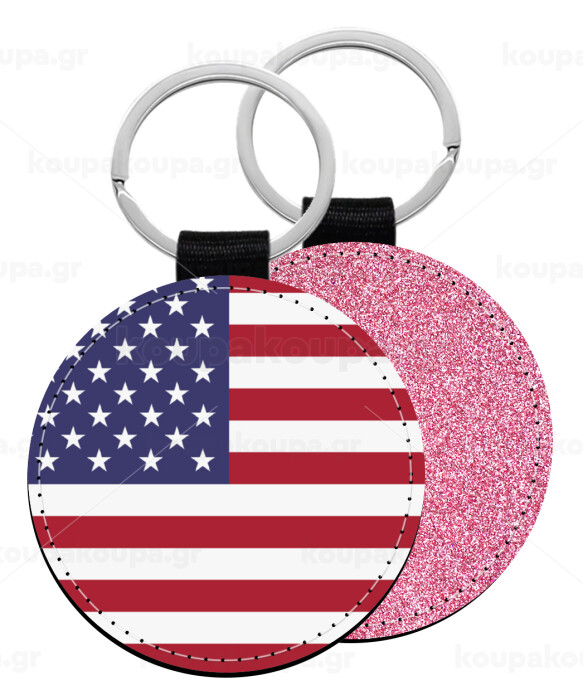 USA Flag, Μπρελόκ Δερματίνη, στρογγυλό ΡΟΖ (5cm)