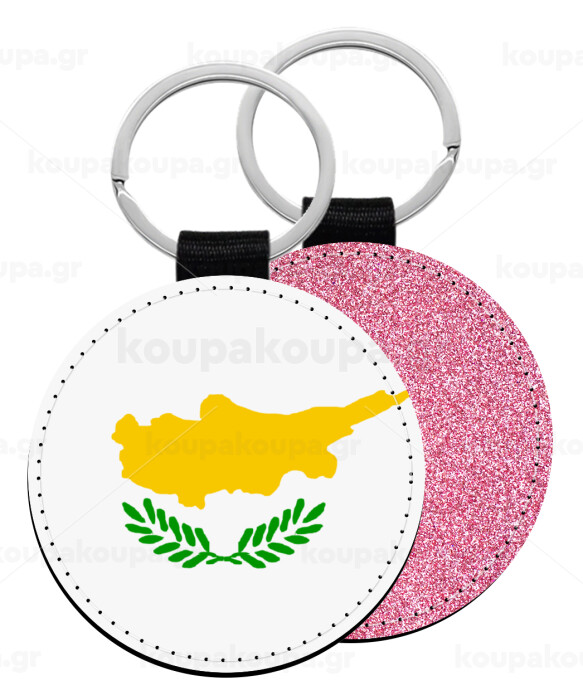 Cyprus flag, Μπρελόκ Δερματίνη, στρογγυλό ΡΟΖ (5cm)