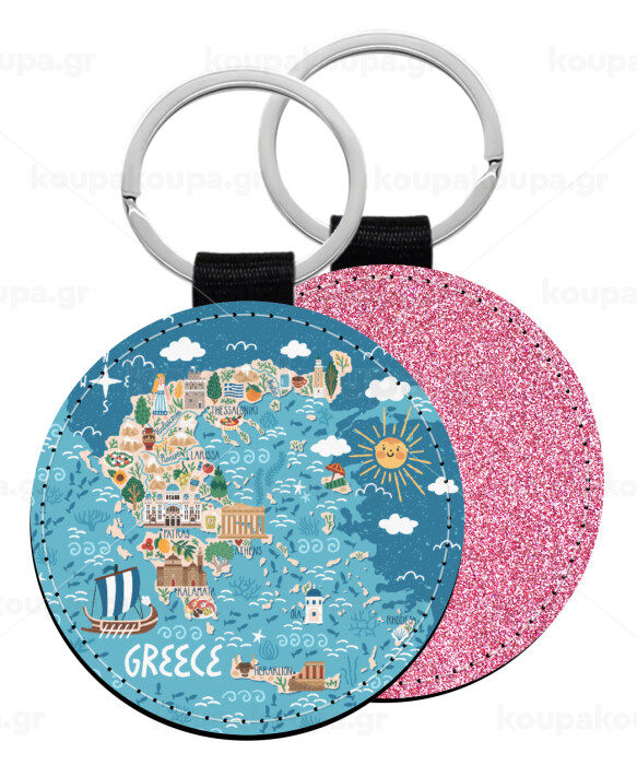 Greek map, Μπρελόκ Δερματίνη, στρογγυλό ΡΟΖ (5cm)