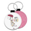 Leatherette keychain with glitter on one side and high resistance leatherette on the other. Safety ring for the keys.