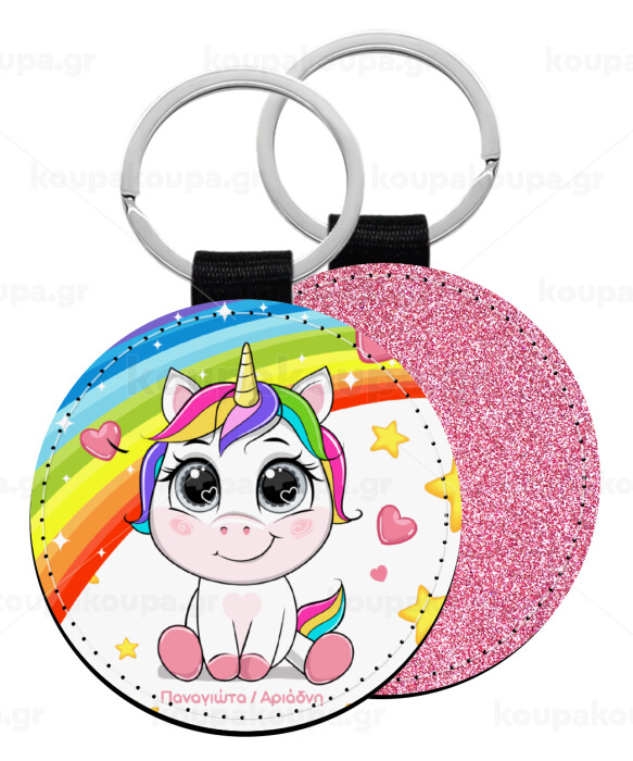 Unicorn baby με όνομα, Μπρελόκ Δερματίνη, στρογγυλό ΡΟΖ (5cm)