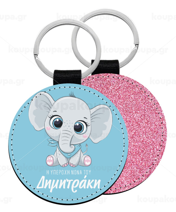 Η νονά μου, ελεφαντάκι γαλάζιο, Μπρελόκ Δερματίνη, στρογγυλό ΡΟΖ (5cm)