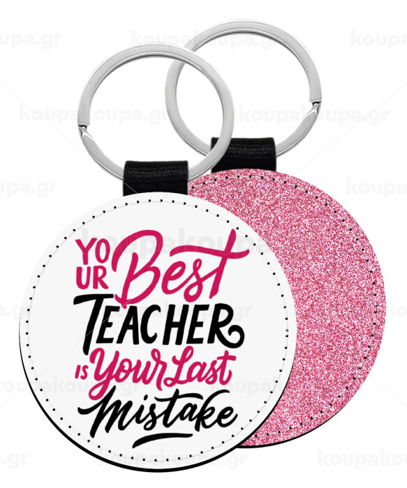 Typography quotes your best teacher is your last mistake, Μπρελόκ Δερματίνη, στρογγυλό ΡΟΖ (5cm)