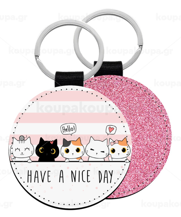 Have a nice day cats, Μπρελόκ Δερματίνη, στρογγυλό ΡΟΖ (5cm)