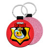 Leatherette keychain with glitter on one side and high resistance leatherette on the other. Safety ring for the keys.