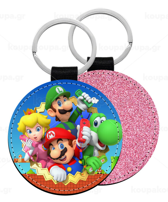 Super mario and Friends, Μπρελόκ Δερματίνη, στρογγυλό ΡΟΖ (5cm)