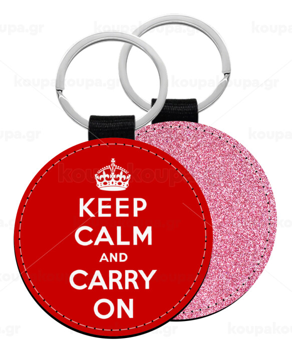 KEEP CALM  and carry on, Μπρελόκ Δερματίνη, στρογγυλό ΡΟΖ (5cm)