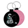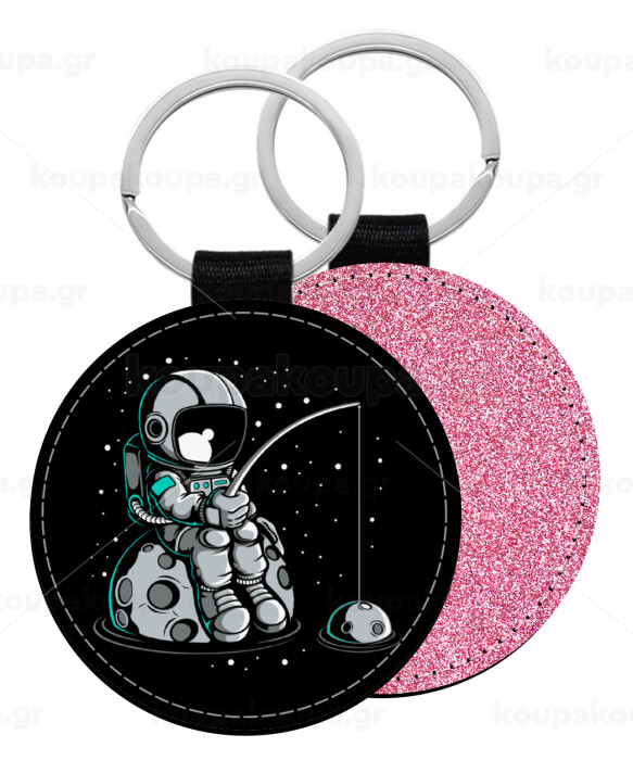 Little astronaut fishing, Μπρελόκ Δερματίνη, στρογγυλό ΡΟΖ (5cm)