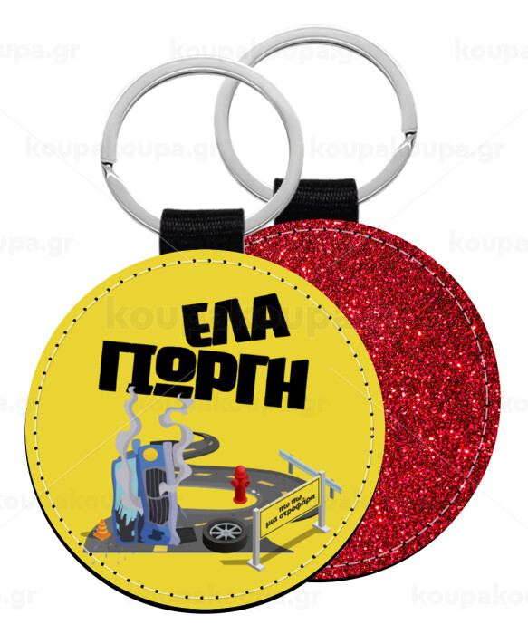 Έλα Γιώργη, πω πω μια στροφάρα, Μπρελόκ Δερματίνη, στρογγυλό ΚΟΚΚΙΝΟ (5cm)