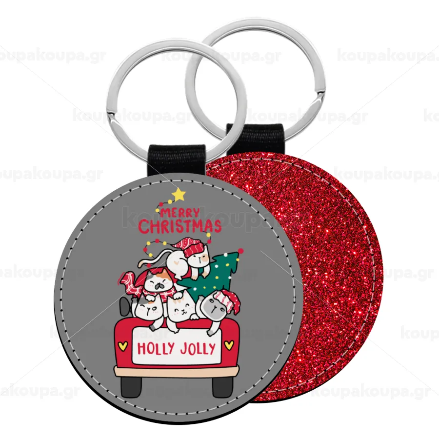 Merry Christmas cats in car, Μπρελόκ Δερματίνη, στρογγυλό ΚΟΚΚΙΝΟ (5cm)