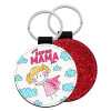 Leatherette keychain with glitter on one side and high resistance leatherette on the other. Safety ring for the keys.