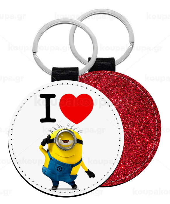 I love by minion, Μπρελόκ Δερματίνη, στρογγυλό ΚΟΚΚΙΝΟ (5cm)