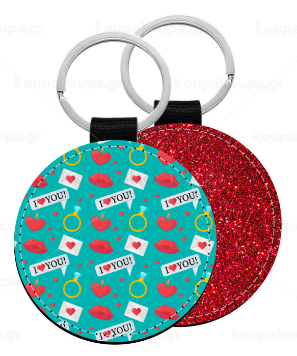 I Love You hearts rings & kiss pattern, Μπρελόκ Δερματίνη, στρογγυλό ΚΟΚΚΙΝΟ (5cm)