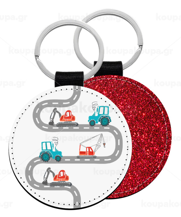 excavator along road, Μπρελόκ Δερματίνη, στρογγυλό ΚΟΚΚΙΝΟ (5cm)