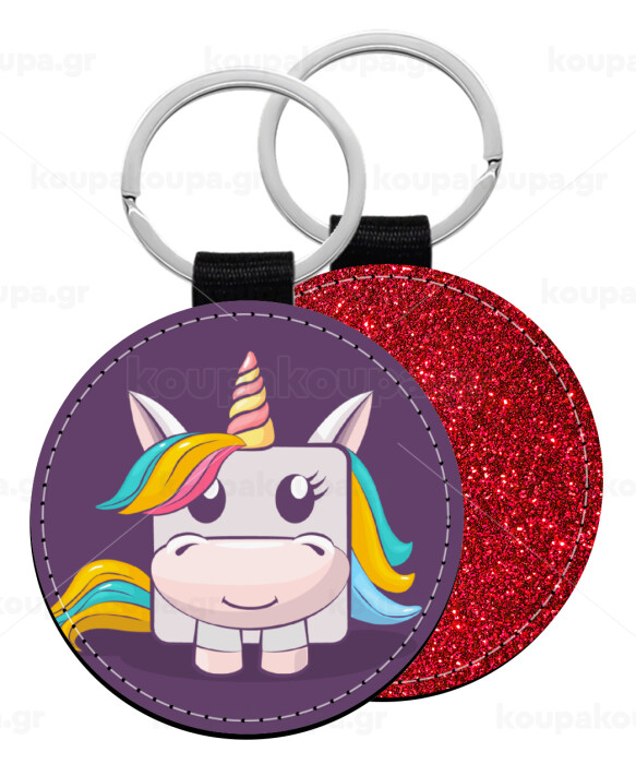 Unicorns cube, Μπρελόκ Δερματίνη, στρογγυλό ΚΟΚΚΙΝΟ (5cm)