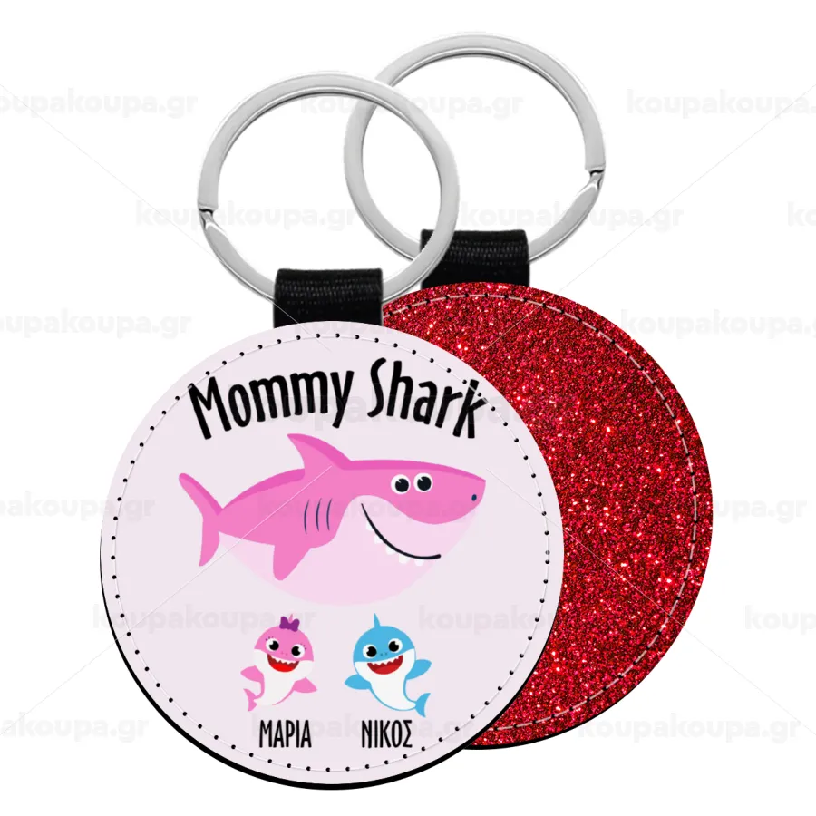 Mommy Shark (με ονόματα παιδικά), Μπρελόκ Δερματίνη, στρογγυλό ΚΟΚΚΙΝΟ (5cm)