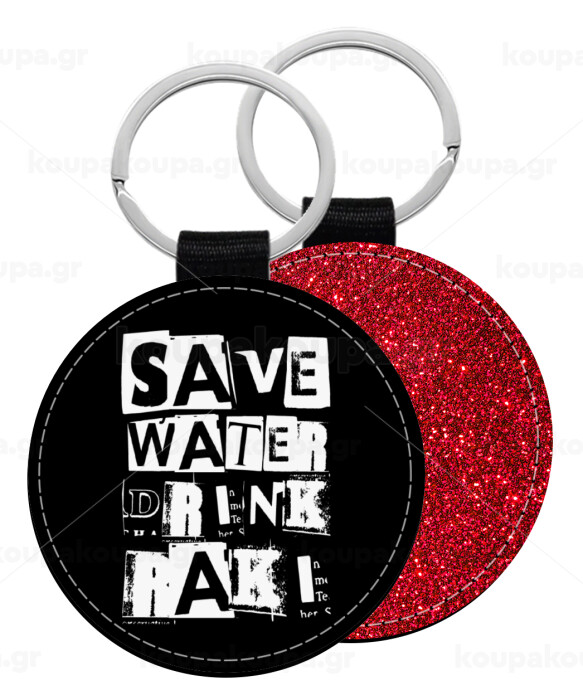 Save Water, Drink RAKI, Μπρελόκ Δερματίνη, στρογγυλό ΚΟΚΚΙΝΟ (5cm)