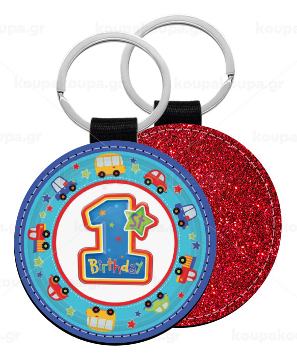 Happy 1st Birthday, Μπρελόκ Δερματίνη, στρογγυλό ΚΟΚΚΙΝΟ (5cm)