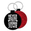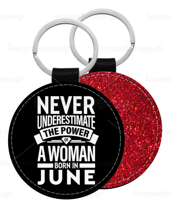 Never Underestimate the poer of a Woman born in..., Μπρελόκ Δερματίνη, στρογγυλό ΚΟΚΚΙΝΟ (5cm)