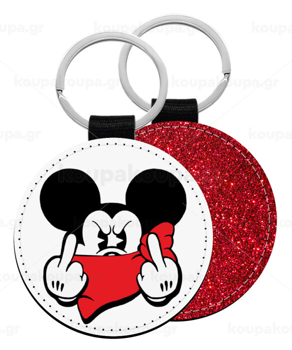 Mickey fuck off, Μπρελόκ Δερματίνη, στρογγυλό ΚΟΚΚΙΝΟ (5cm)