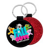 Leatherette keychain with glitter on one side and high resistance leatherette on the other. Safety ring for the keys.