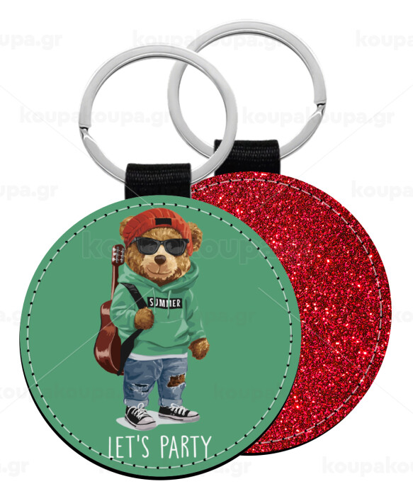 Let's Party Bear, Μπρελόκ Δερματίνη, στρογγυλό ΚΟΚΚΙΝΟ (5cm)