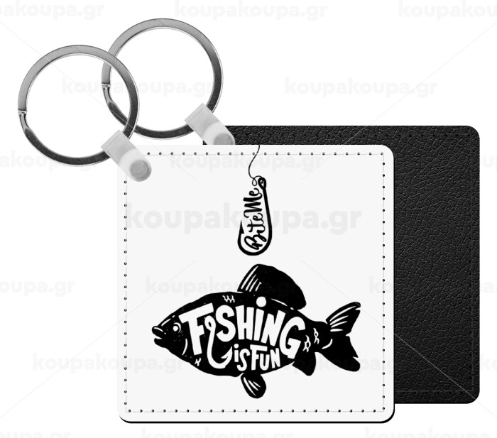 Fishing is fun, Μπρελόκ Δερματίνη, τετράγωνο ΜΑΥΡΟ (5x5cm)