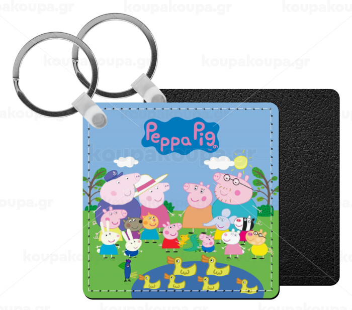 Peppa pig Family, Μπρελόκ Δερματίνη, τετράγωνο ΜΑΥΡΟ (5x5cm)