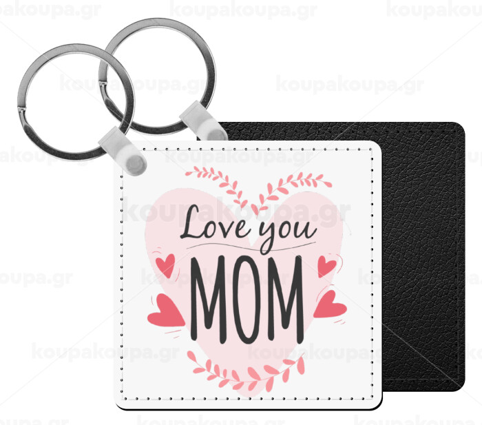 I Love you Mom pink, Μπρελόκ Δερματίνη, τετράγωνο ΜΑΥΡΟ (5x5cm)