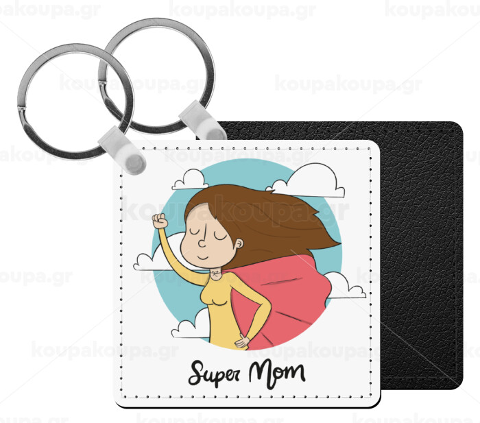 Super mom, Μπρελόκ Δερματίνη, τετράγωνο ΜΑΥΡΟ (5x5cm)