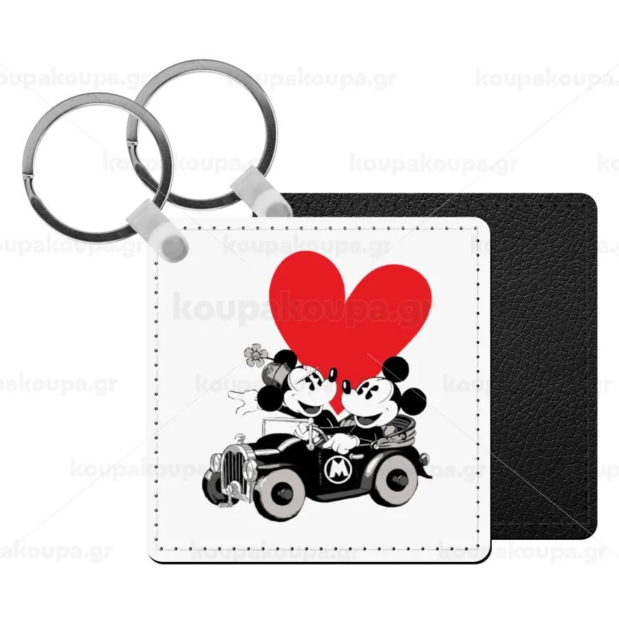 Mickey & Minnie love car, Μπρελόκ Δερματίνη, τετράγωνο ΜΑΥΡΟ (5x5cm)
