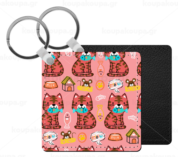 Cats and Fishes, Μπρελόκ Δερματίνη, τετράγωνο ΜΑΥΡΟ (5x5cm)