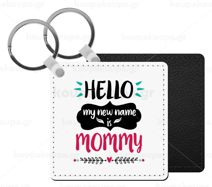 Hello, my new name is Mommy, Μπρελόκ Δερματίνη, τετράγωνο ΜΑΥΡΟ (5x5cm)
