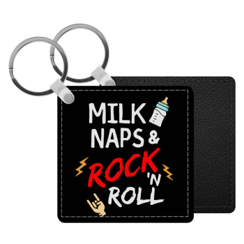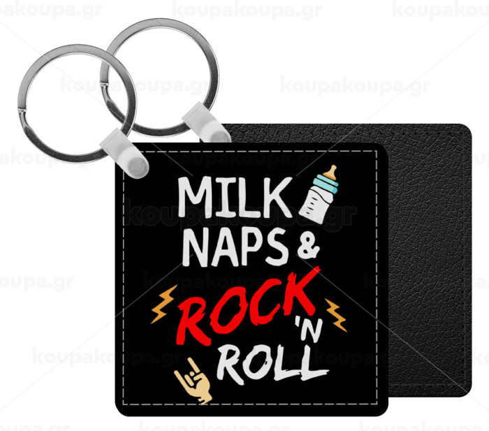 milk naps and Rock n' Roll, Μπρελόκ Δερματίνη, τετράγωνο ΜΑΥΡΟ (5x5cm)