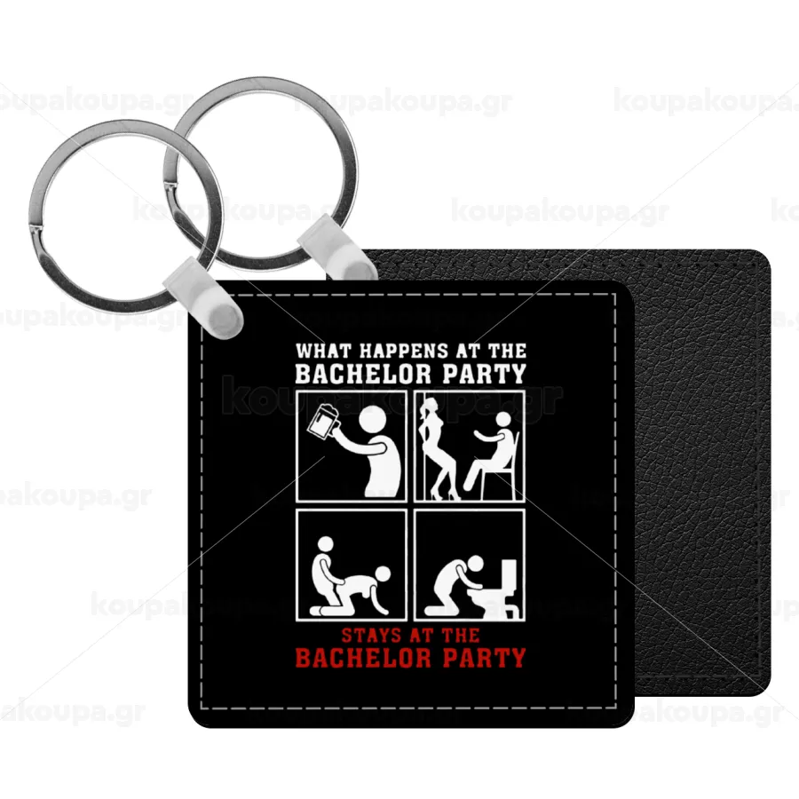 What happens at the bachelor party, stays at the bachelor party!, Μπρελόκ Δερματίνη, τετράγωνο ΜΑΥΡΟ (5x5cm)