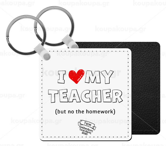 i love my teacher but no the homework outline, Μπρελόκ Δερματίνη, τετράγωνο ΜΑΥΡΟ (5x5cm)