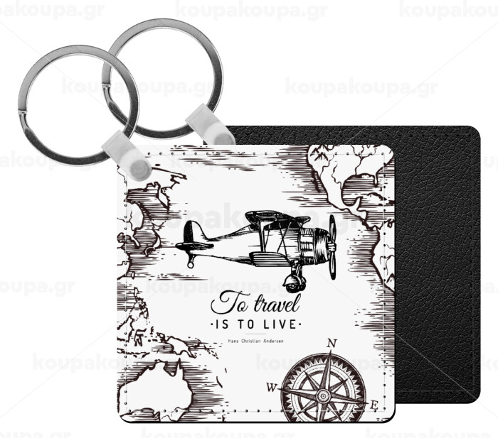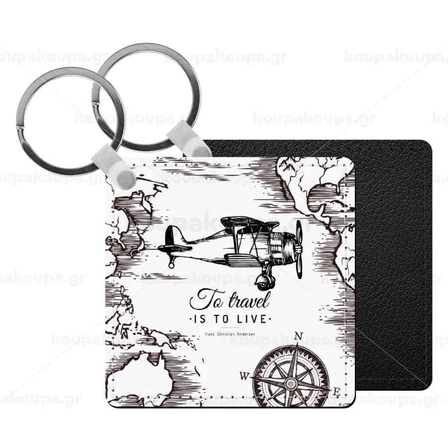 To travel is to live, Μπρελόκ Δερματίνη, τετράγωνο ΜΑΥΡΟ (5x5cm)