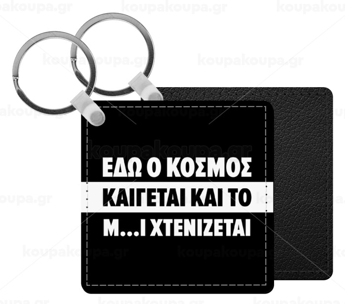 Εδώ ο κόσμος καίγεται και το Μ....Ι χτενίζεται, Μπρελόκ Δερματίνη, τετράγωνο ΜΑΥΡΟ (5x5cm)
